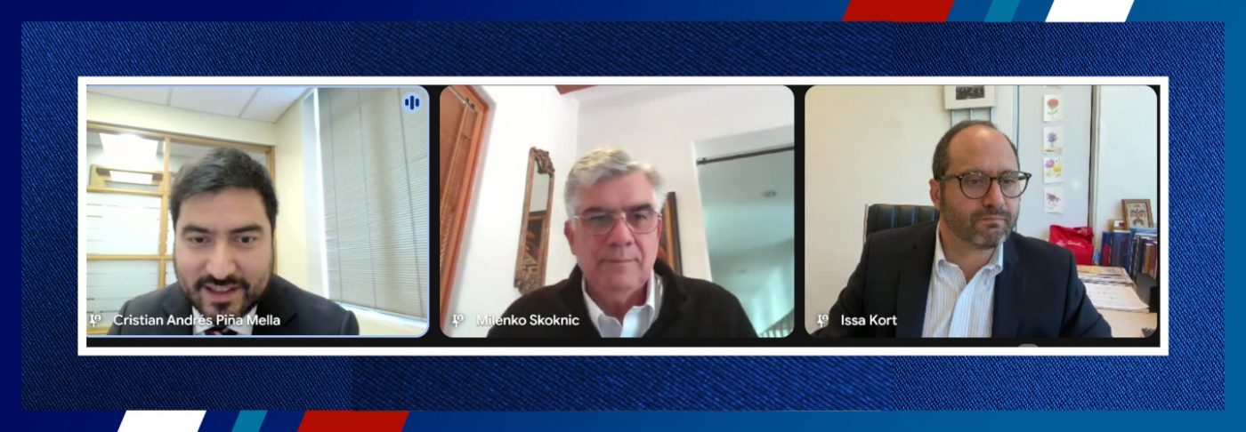 En una nueva sesión del ciclo Diálogos de ADICA, la Asociación de Diplomáticas y Diplomáticos de Carrera recibió al Embajador (r) Milenko Skoknic y al ex diputado Issa Kort, integrantes del equipo de Relaciones Exteriores de la candidatura presidencial de Evelyn Matthei, representante de la coalición Chile Vamos.